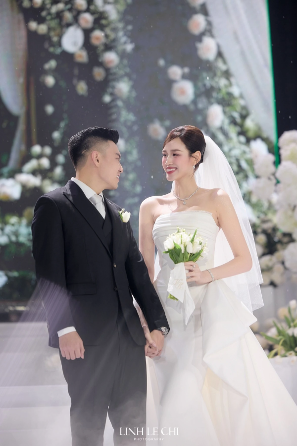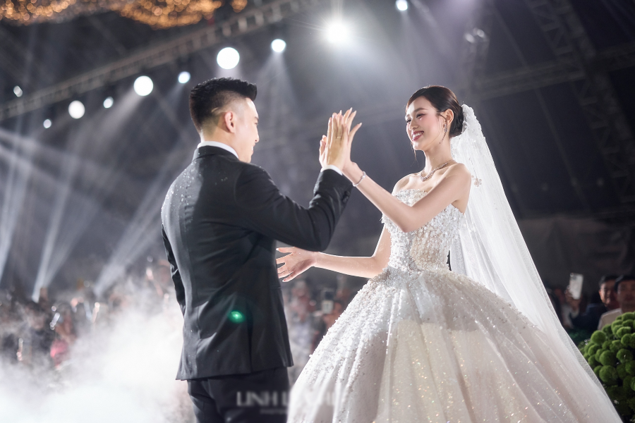 Sau lễ rước dâu ấm cúng tại quê nhà cô dâu ở Thanh Hóa vào buổi sáng, tiệc cưới buổi tối tại Quảng Trị là dịp để cặp đôi chung vui cùng người thân, đối tác kinh doanh và bạn bè thân thiết. Dù thời tiết bất lợi, hàng nghìn người dân và khách mời vẫn đến chung vui, khiến buổi lễ trở nên ấm áp và đáng nhớ.